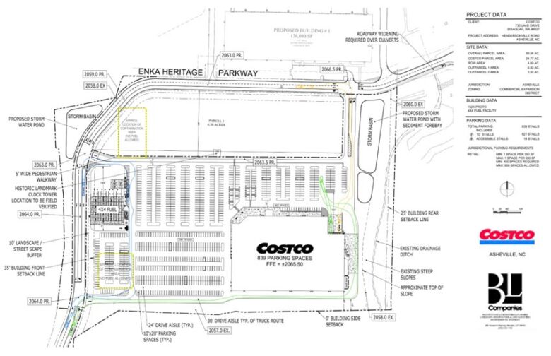 Plans on file with the city show the Costco situated on a 25-acre site within Enka Commerce Park, with 839 parking spaces. The plans also show the nearby historic Enka clock tower, which Samet has committed to preserving.