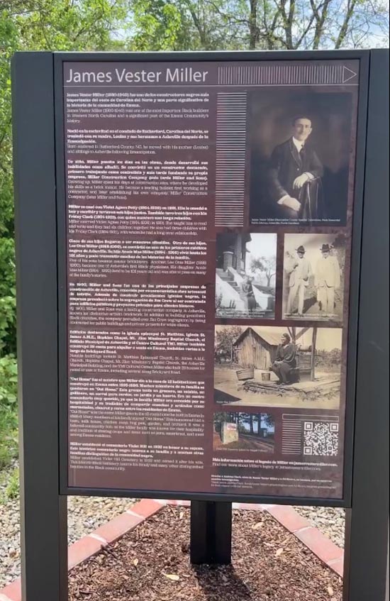 The park is named after James Vester Miller (1860-1940), one of the most important black builders in western North Carolina and a significant part of the Emma community’s history. His story is featured on the new historical marker in the park. His granddaughter, Andrea Clark, generously advised La Esperanza on the content for the marker.