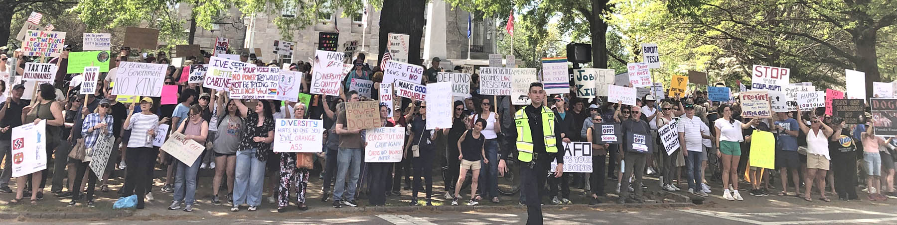 The attendance for the April 5 “Hands Off!” pro-democracy rally in the capital city, according to The News and Observer, was estimated to be around 4,500. Add the numbers in Durham and Chapel Hill, and the Triangle evidently had at minimum of 7,000 on the streets, with smaller towns adding more. Then the Charlotte protest produced at least 3,000 more. And Asheville, the so-called “Western Capital,” may have been the top protest-getter with more than 7,000 all on its own. Other areas were not left out. There were reportedly hundreds in Wilmington, Winston-Salem, over a thousand in Greensboro….