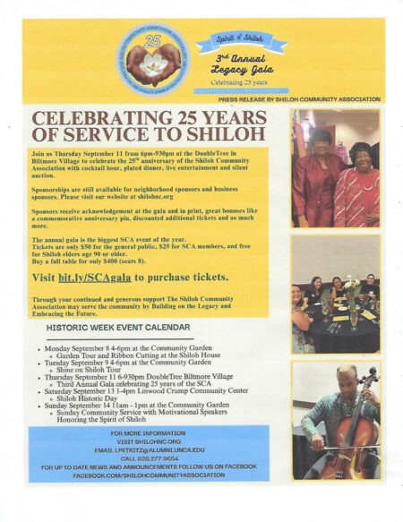 For 25 years, the Shiloh Community Association (SCA) has worked to preserve and uplift the voices, culture, and heritage of our historic neighborhood. This gala is a time to reflect, share stories, and continue investing in Shiloh’s future through unity and celebration. The gala is the largest fundraiser of the year, and allows the SCA to continue to serve the community guided by the needs of the residents.