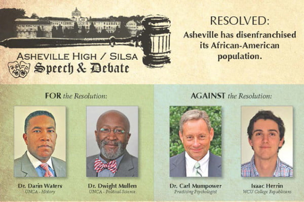 Asheville and area residents are invited to attend a community debate in which four prominent citizens will debate against and in support of the following resolution: Asheville has disenfranchised its African-American population.