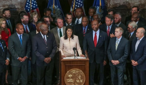 COLUMBIA, SC – In the wake of the mass murders of nine people in Emmanuel AME Church, South Carolina Governor Nikki Haley stood with a bi-partisan delegation of state legislators to call for the confederate flag to be taken down from the state capitol grounds.