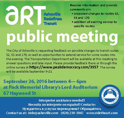 The City of Asheville is requesting feedback on possible changes to transit routes S2, S3 and 170, as well as opportunities to extend service for some routes into the evening. The Transportation Department will be available at this meeting to answer questions and take input.