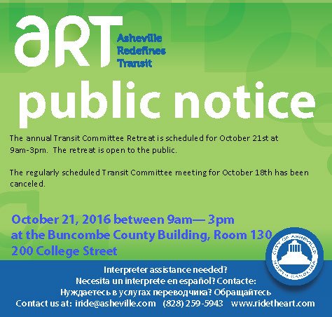 The annual Transit Committee Retreat is scheduled for Friday, October 21, 2016 between 9am and 3pm. The retreat will be held at the Buncombe County Building, Room 130,