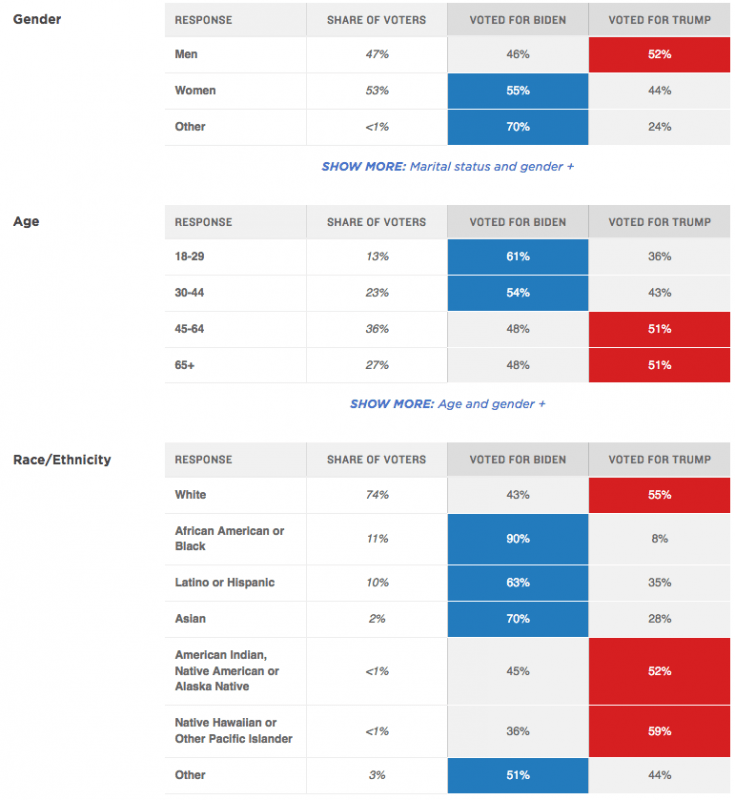 Demographic measures and issues include: Gender, Age, Race, Ethnicity, Education, Household Income, Urban/Rural, Coronavirus, Racism, Leadership, and whether voters voted early or in-person.