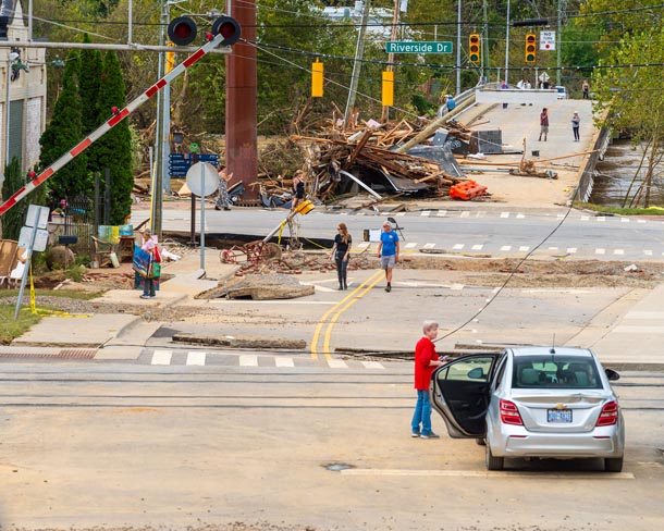 The lower-lying sections of the town, especially on Riverside Drive, saw significant flooding. Fallen trees and power lines have made the streets impassable. There are also power outages in Woodfin. Trash and recycling services are paused indefinitely.