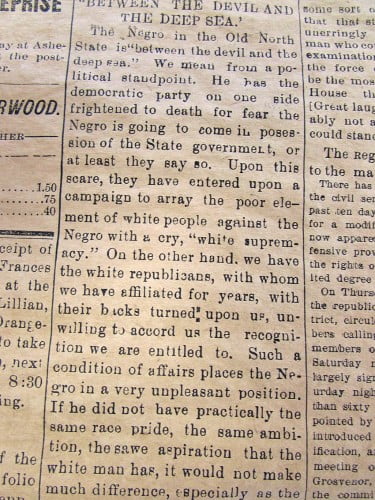An article from the Colored Enterprise titled “Between the Devil and the Deep Sea” captures the progressive struggles of inclusiveness for African Americans in North Carolina government during that era, more than 117 years ago.