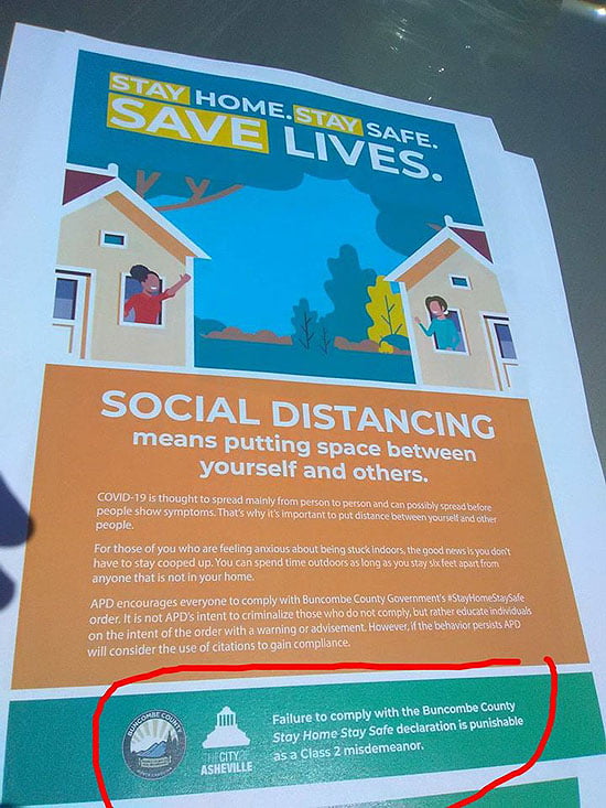 But what I also didn’t see were cops, or any of these fliers. So far, these only seem to be posted in Asheville’s (overwhelmingly Black) public housing complexes. Local governments’ “stay at home” communications to the general public have downplayed criminal charges. This highlights it.