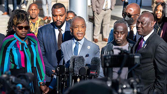 Ahmaud Arbery’s mother, Wanda Cooper-Jones, stands next to Rev. Al Sharpton. Marcus Arbery Sr., Arbery’s father stands to the right of Sharpton.