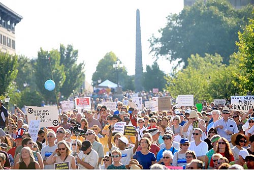 The Moral Monday rallies drew national attention along with thousands of participants in Raleigh, and the largest of all, with 10,000 people, took place in Asheville in August. Conservative African American churches found themselves in common cause with women’s rights and gay rights organizations, environmentalists, healthcare advocates, and civil rights groups in objecting to the takeover of state government by radicals funded, in many cases, by secretive, self-serving multi-millionaires.