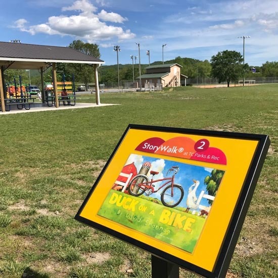 Using pages from a deconstructed children’s book, a story is displayed along trails or walking paths on poster boards, attached to fences, or encased in outdoor frames. Pages are often accompanied by activity prompts and questions.